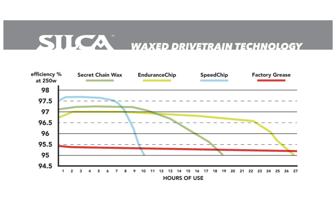 SpeedChip is a full synthetic wax made from the same exotic base oils used in SILCA Synergetic. It’s the fastest wax ever used in a cycling lubricant, enhanced with three sizes of sub-micron and nanoscale Tungsten Disulfide platelets to further reduce friction and improve anti-wear properties. Testing has shown SpeedChip can improve chain efficiency by up to 0.5% over SILCA Secret Chain Blend Hot Melt. The only trade-off? You’ll need to reapply it more often (see chart for details).